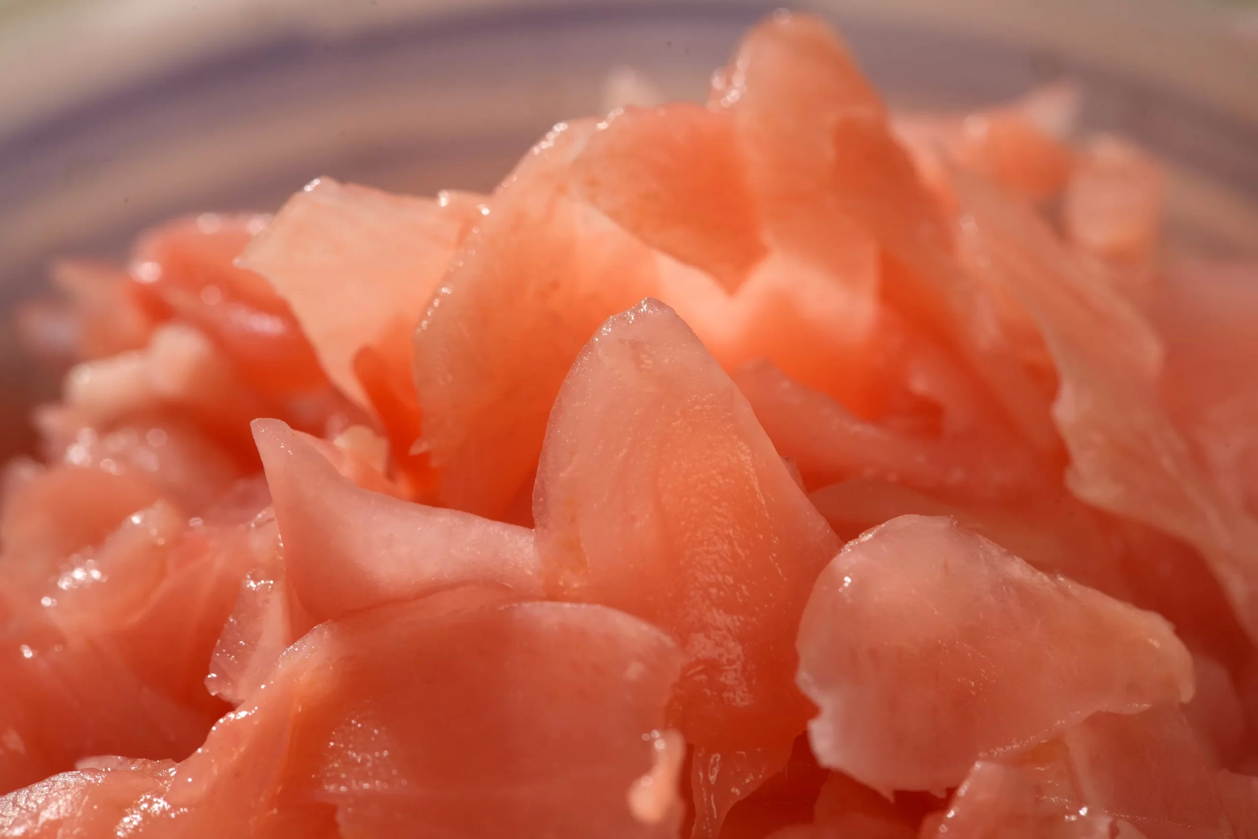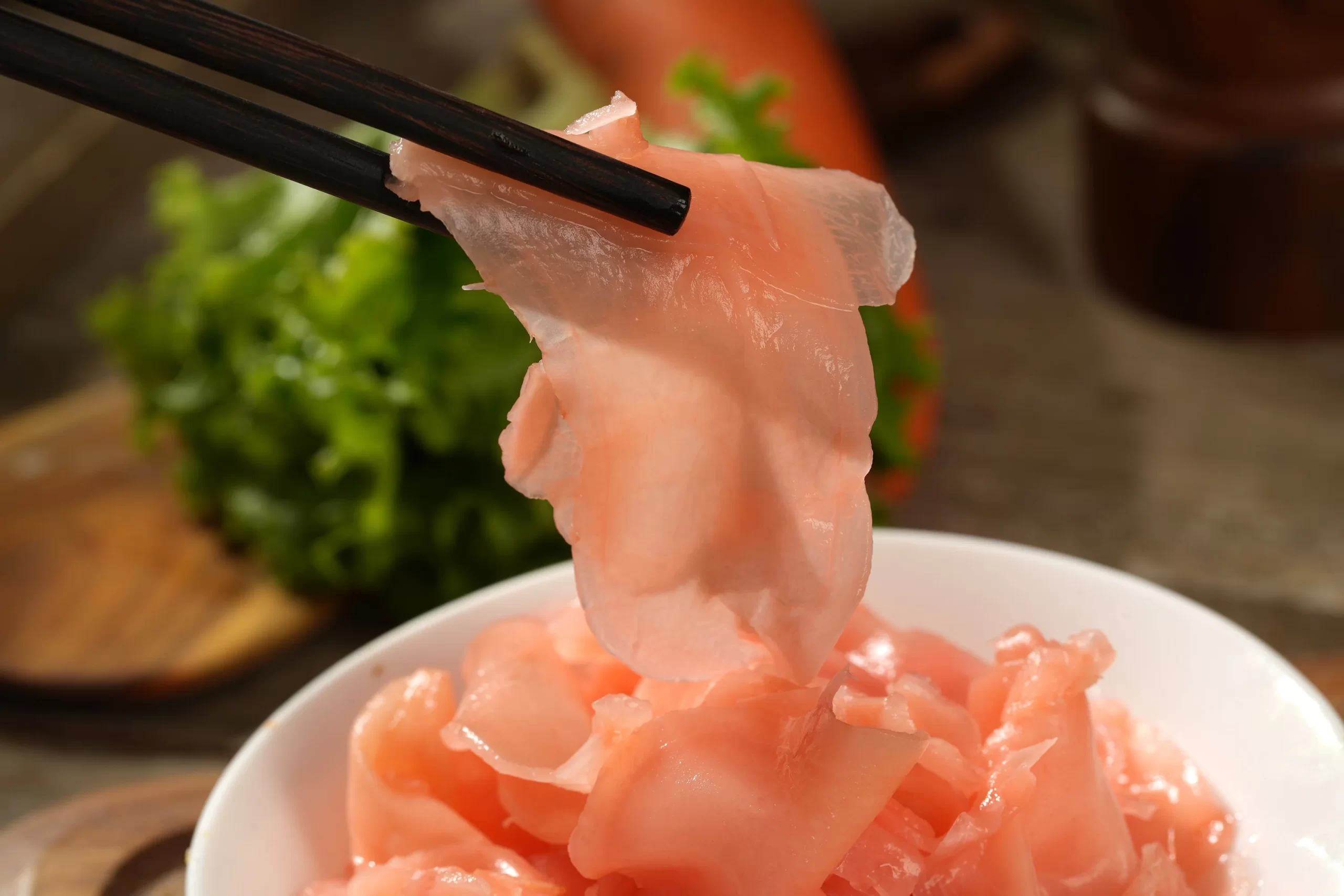 Japanese Healthy Sliced Pink Pickled Sushi Ginger Preserved Ginger For Sushi Pink Seasoned Pickled Sushi Ginger, Spicy, sweet, ideal for Japanese Sushi restaurant, instant food for Salad,